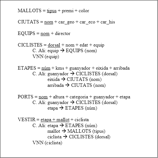 !!! Note "" En principi, la clau hauria de ser tots els camps, però com és lògic, suposem que un vehicle, en una data (de compra), només té un ciutad--> propietari (y uns km y un estat).