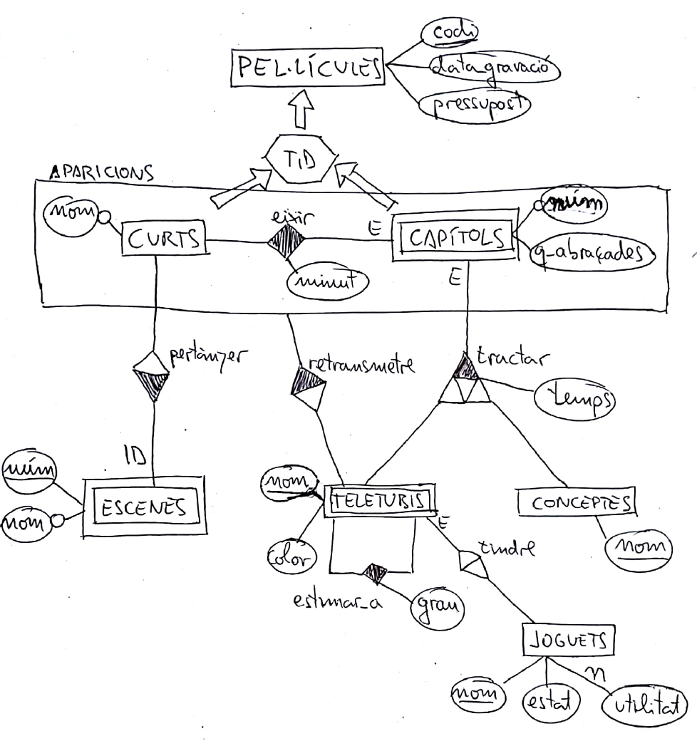 Haz el paso a tablas del siguiente esquema E/R. Indica las tablas (en MAYÚSCULAS) con sus atributos (en minúsculas), claves primarias, foráneas, alternativas, valores no nulos, etc.