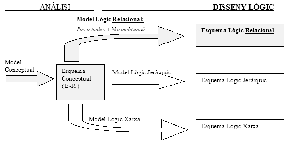 Durante la fase de diseño lógico transformaremos el Esquema Conceptual (Diagrama Entidad-Relación) en un Esquema Lógico. ¿Cómo? Se puede hacer de diferentes formas, llamadas modelos lógicos.