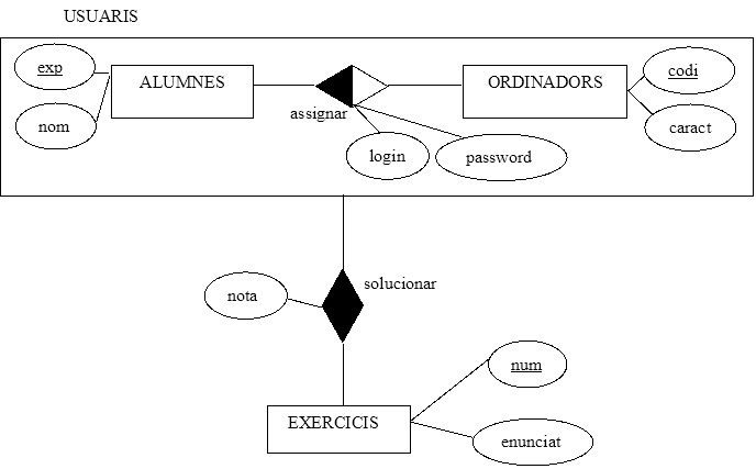Para que la solución sea más sencilla he puesto la relación de la agregación (asignar) como una tabla a parte y con el nombre de la agregación (Usuarios). De esta manera una vez resuelta la agregación, la relación solucionar se relacioonará M:M entre la tabla Usuarios y la de Ejercicios.