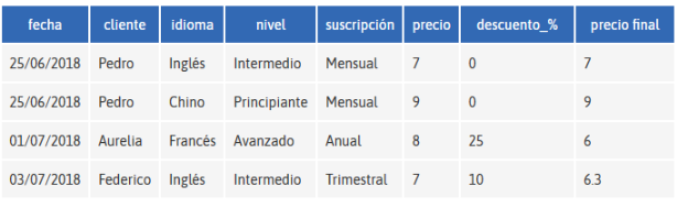 Ens adonem que no està normalitzada ja que el nivell i el preu depenen de l’idioma, el descompte depén del tipus de subscripció, etc.