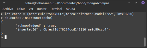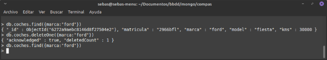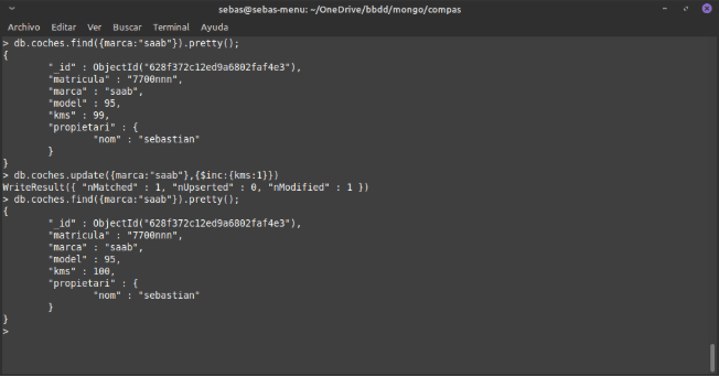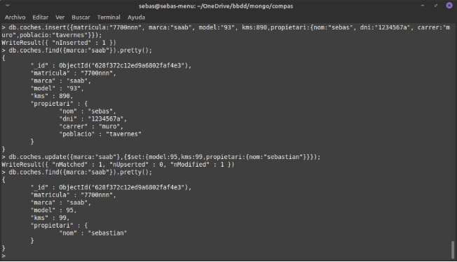 Cap remarcar que si fem un update d’un document que té un objecte embegut, cal posar totes les dades d’eixe objecte. Si no, es perden els camps de l’objecte.