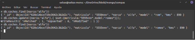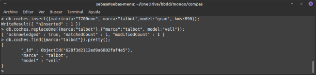 .replaceOne(filtre, canvi, opcions), canvia un document per un altre.