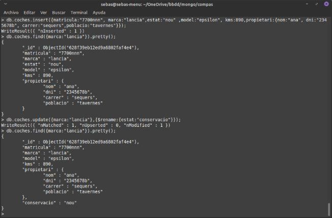 Exemple de update amb $rename, on vorem que es canvia el nom del camp, però es col·locarà al final del document.