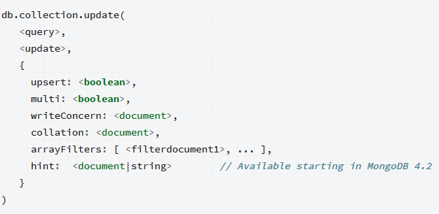 - multi: Booleà, per defecte false. L'operació update només modifica el primer document que complisca el "where". Si posem este booleà a true, s'actualitzaren tots els documents que ho complisquen (farà com un updateMany).