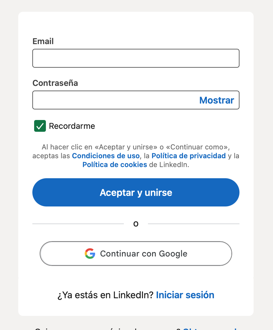Primero, vamos a la página de LinkedIn y hacemos clic en "Únete ahora" para registrarnos.